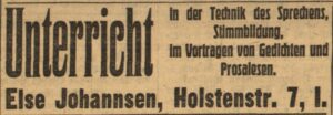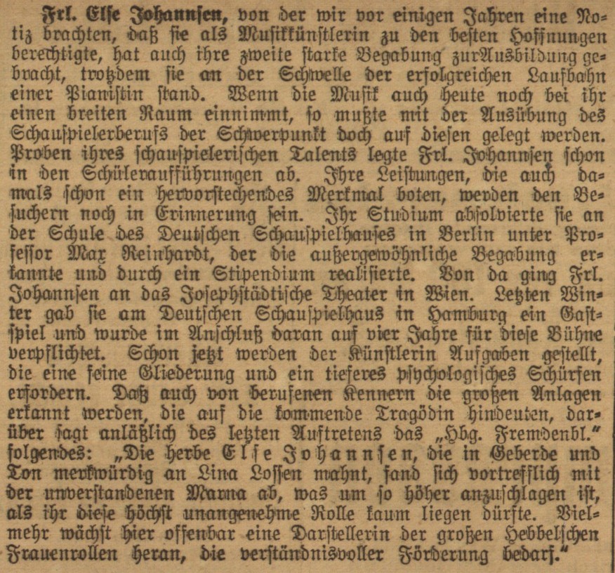Else Johannsen, aus bürgerlichem Haus in der Holstenstraße in Bergedorf, hatte ihre ersten öffentlichen Auftritte als Pianistin bei den Kaffeestunden der Bergedorfer Hausfrauen im Hotel Bellevue (BZ vom 6. März und 7. Mai 1914). Bei einem Wohltätigkeitskonzert in der Aula der Stadtschulen begleitete sie den renommierten Konzertmeister Heinrich Bandler und knüpfte eventuell bereits Kontakte zu Robert Nhil vom Deutschen Schauspielhaus (BZ vom 17. und 20. März 1916). Zu dieser Zeit war sie Schülerin an der Klavier-Akademie von Hans Hermanns, spielte Kammermusik und gab Begleitungsstunden (Anzeigen Johannsens in der BZ, z.B. vom 1. April 1916 und 23. Juni 1917).
