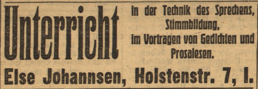 Es kam anders: in einer Anzeige vom Mai 1923 bezeichnete sie sich als „ehemaliges Mitglied des Deutschen Schauspielhauses“ (BZ vom 8. Mai 1923). Ob die Inflationsprobleme des Jahres dabei ausschlaggebend für das vorzeitige Vertragsende waren oder ob andere Gründe vorlagen, ist nicht bekannt, auch nicht, wie erfolgreich sie als freiberufliche Lehrerin (auch für Klavier) war.
