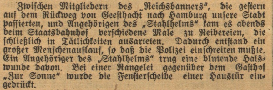 Erst getrennt feiern, dann auf einander einschlagen und die Gegenseite für die Auseinandersetzung verantwortlich machen – so könnte das Motto gelautet haben: In Geesthacht hatte die Ortsgruppe des Reichsbanners mit Gästen aus Hamburg und Bergedorf die feierliche Bannerweihe vorgenommen, nach Bergedorf war u.a. der Jung-Stahlhelm der Einladung des Kavalleristenvereins gefolgt, sein 25jähriges Bestehen mit Standartenweihe (durch den Bergedorfer Pastor Behrmann) zu feiern (BZ vom 11. September, 4., 6., 7., und 12. Oktober). (Zu Reichsbanner und Stahlhelm siehe die Beiträge „Stahlhelm“ vs. „Reichsbanner“ und Äußerlich vs. Wesentlich.)