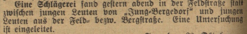 Das Reichsbanner hatte eine Bergedorfer Jugendgruppe, das „Jungbanner“; nach den von Alfred Dreckmann 1987 notierten Erinnerungen Michael Pritzls wurde Pritzl dort 1926 Mitglied und war an einer „wüsten Schlägerei“ mit den „Rabauken vom ‚Jung-Bergedorf‘“ auf dem Gojenberg beteiligt (S. 87f.). Klein merkt dazu an, dass er nichts über eine derartige Prügelei finden konnte (S. 156), aber vielleicht hat er sich zu sehr auf die Jahresangabe Pritzls verlassen: eine BZ-Meldung von 1925 schildert jedenfalls ein solches Ereignis.