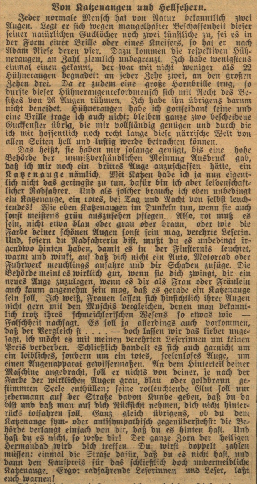 Dem BZ-Redakteur Hanns Lotz genügten seine zwei Augen, doch „eine hohe Behörde“ verordnete ihm die Anschaffung eines weiteren: „ein Katzenauge nämlich.“ Dieses dritte Auge benötigte der Radfahrer Hanns Lotz: es hatte aus rotem Glas zu bestehen und war hinten am Fahrrad anzubringen.