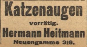Man darf vermuten, dass der benötigte Nachschub rechtzeitig eintraf. Im hamburgischen Neuengamme, wo sie ja nicht unbedingt erforderlich waren, konnte man Katzenaugen jedenfalls kaufen.