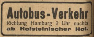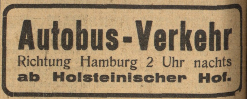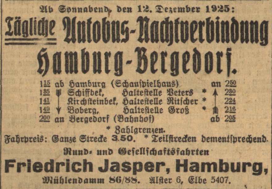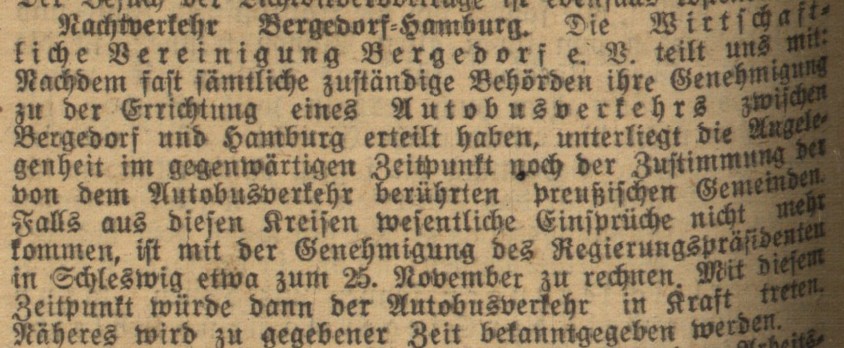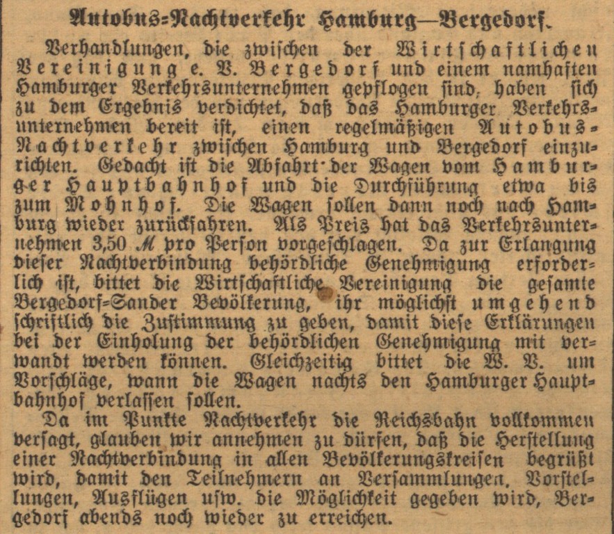 Vermutlich waren auch 1925 das abendliche kulturelle Angebot und das Nachtleben in Hamburg vielfältiger als in Bergedorf, und so stand bei dem geplanten Autobus-Nachtverkehr die Richtung von Hamburg nach Bergedorf im Vordergrund. Natürlich ging es auch in die Gegenrichtung – die Wagen mussten ja wieder zurück – aber da werden die Busse nicht überfüllt gewesen sein.