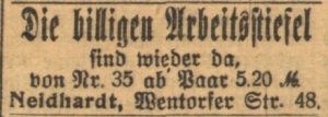 In mehreren Anzeigen wurden Preise für neues Schuhwerk genannt: im Kaufhaus Biebler gab es Herrenstiefel aus Leder von 9,75 bis 22,50 Mark, bei Frank & Nielsen von 7,75 bis 10,75 Mark (BZ vom 3. Oktober und 3. November). Ob Neidhardts Stiefel aus Leder waren ist offen, und für Qualitäts- und Haltbarkeitsvergleiche ist es zu spät.