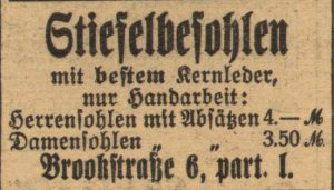 Neue Stiefel kaufen oder die alten neu besohlen lassen? Vor der Entscheidung stand jeder, der seine Sohlen (fast) durchgelaufen hatte. Ein wichtiger Faktor wird dabei der Preis gewesen sein, und wenn in einer Anzeige Preise genannt wurden, dann war es ein Indiz, dass sie unter den ortsüblichen Tarifen lagen.
