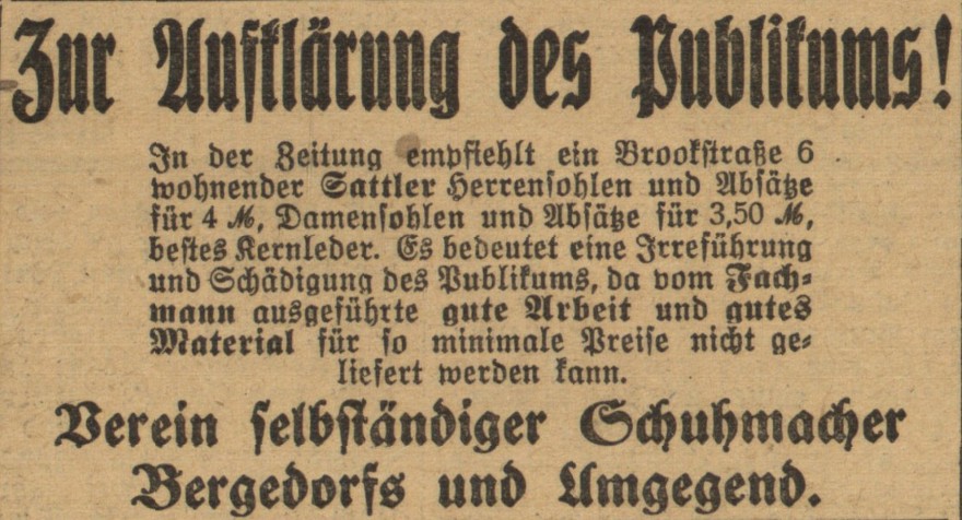 Die Anzeige aus der Brookstraße rief Bergedorfs Vereinigte Schuhmacher auf den Plan, die massiv davor warnten, auf das Angebot einzugehen: nicht nur, weil es von einem Sattler kam und nicht von einem Schuster, sondern auch, weil es zu billig war: gutes Material und gute Handwerksarbeit verlangten nach höheren Preisen.