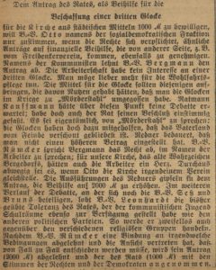 Es gab eine hitzige Debatte: Sollte die Stadt Bergedorf die Anschaffung einer dritten Glocke für die Kirche St. Petri und Pauli bezuschussen, damit das im Krieg dezimierte Geläut (siehe den Beitrag Von Kampfglocken und Friedensglocken) wieder komplettiert würde? Der Rat beantragte dafür bei der Stadtvertretung 1.000 Mark als Zuschuss.