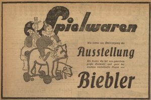 Entsprechend den damaligen Geschlechterrollen waren Puppen das Spielzeug für Mädchen, eben „mütterlich-weiblich“ – ob Grieses „Teddys, Esel, Elefanten“ auch für Mädchen gedacht waren oder (nur) für Jungen, lässt sich nicht mehr klären. Es fällt aber auf, dass es 1925 keine Anzeigen gab, die speziell für „technisch-männliches“ Spielzeug warben, weder Eisenbahnen noch Baukästen oder Gewehre und Militärgarnituren.