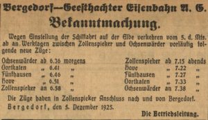Von den Einheimischen wurde dieser Elbstromersatzverkehr offenbar nicht besonders gut angenommen, denn er wurde bald auf drei Werktage reduziert und am 30. Dezember ganz eingestellt (Bekanntmachungen der BGE in der BZ am 12. und 29. Dezember): es war wärmer geworden.