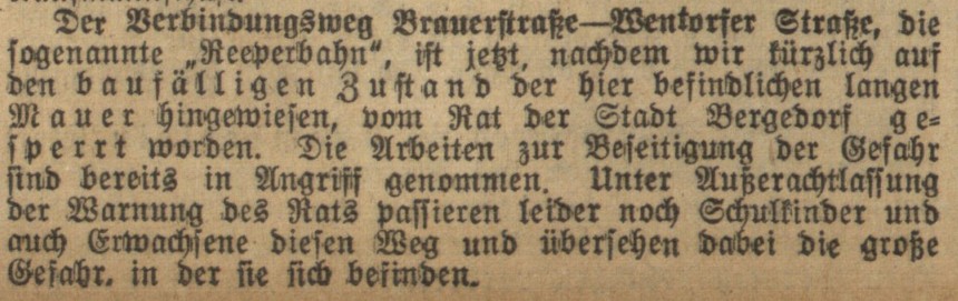 Als die BZ erfuhr, dass eine der Begrenzungsmauern einzustürzen drohte, meldete sie dieses und hoffte, „daß die Angelegenheit zuständigerseits an Ort und Stelle geprüft und eine etwa drohende Gefahr beseitigt wird.“ (BZ vom 24. Februar)