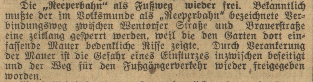 Hatte dieser kleine Weg überhaupt einen Namen? Die BZ hatte offenbar Zweifel, denn sie bezeichnete ihn als „sogenannte Reeperbahn“ bzw. vom „Volksmunde“ so benannt, wobei der Volksmund wohl schon 1926 die Bezeichnung „Stinkbüdelsgang“ verwendete. Das Bergedorfer Adreßbuch 1928 führt in seinem Straßenplan (S. 33) den Namen Reeperbahn auf, was für eine offizielle Nomenklatur spricht. Heute heißt die Verbindung laut Straßenschild „Reeperstieg“.
